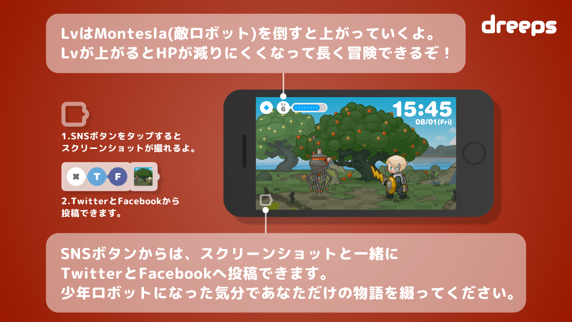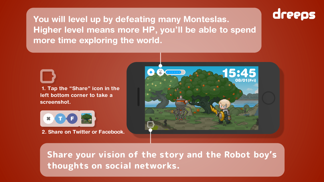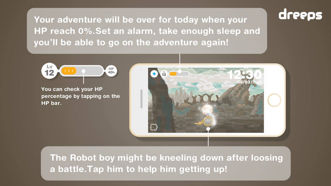 dreepsに必要なことはアラームをセットする、たったのそれだけ。デスクに置いて仕事をしながらときどき冒険を眺めてみたり、おやつの時間に様子を覗いてみたり、生活に合わせてゆっくり楽しんでください。dreepsで目を覚ました日は、少年ロボットのHPが続けば、アプリを起動していない間も冒険は進んで行きます。ときにはイベントを見逃すこともあるでしょう。でもあまり気にしないでください。ゲーム中にセリフはほとんどないのです。ビジュアルとサウンドをヒントに、少年ロボットになった気分であなただけの物語を、SNSボタンから紡いでみてください。