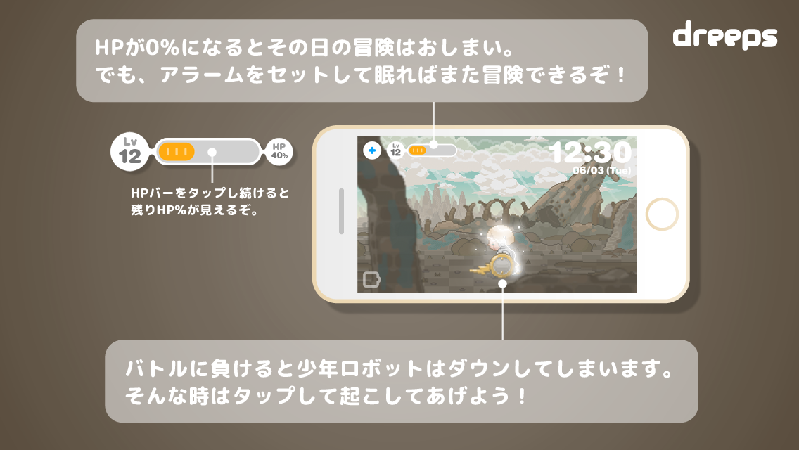 アラームをセットするだけでRPGの冒険気分が楽しめる "アラームプレイングゲーム” の登場です。眠る前にdreepsでアラームをセットすると、主人公の少年ロボットも眠りにつきます。しっかり睡眠時間を取ってHPを回復しましょう。