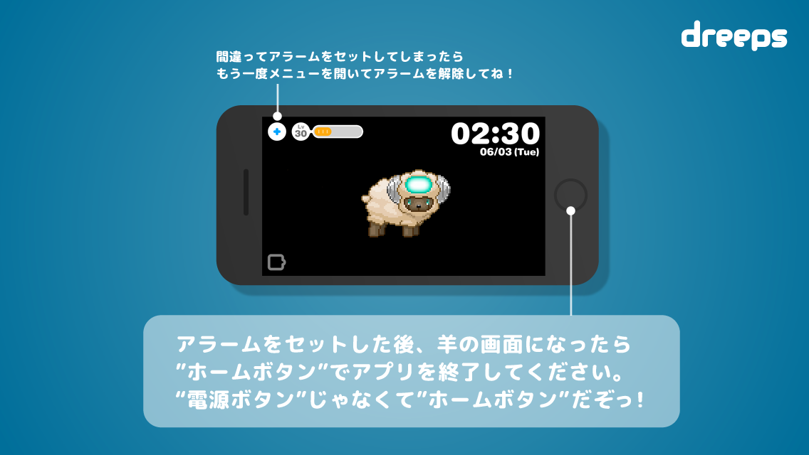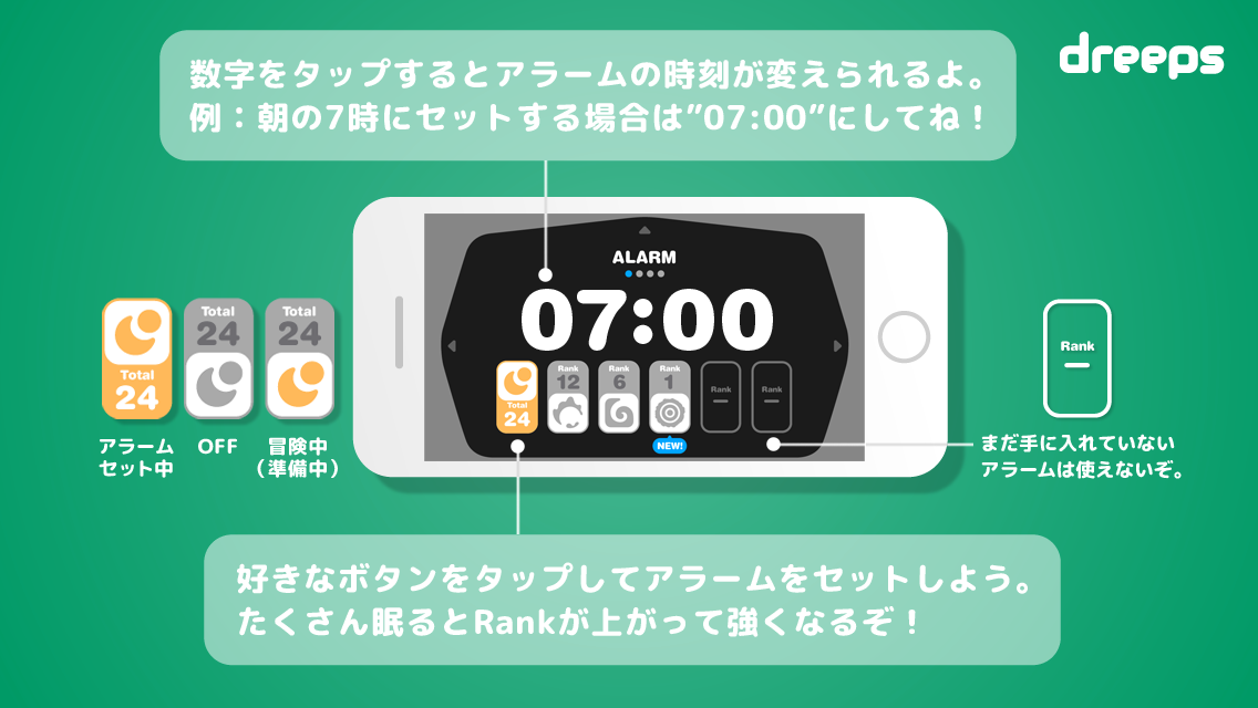 眠る前にdreepsでアラームをセットしてください。ぐっすり眠ってHPを回復しよう。